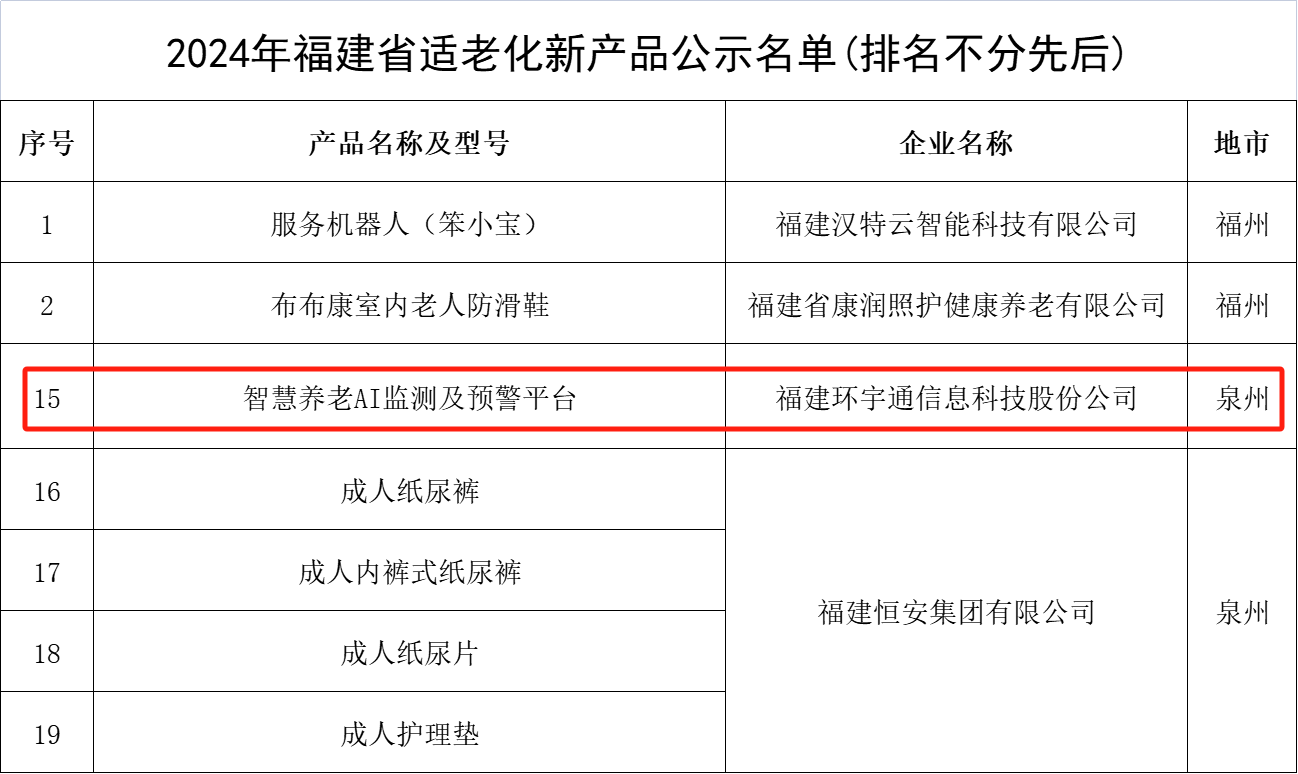 2024年11月19日,2024年福建省适老化新产品公示名单公布,全省有24款产品位列名单,泉州共有五款产品入选。其中凯发k8国际依托技术积累和创新能力所推出的“智慧养老AI监测及预警平台”入选该名单。这一荣誉不仅是对公司在“AI+医疗康养”领域的长期努力和贡献的肯定,更是对未来持续创新与高质量开展的激励。